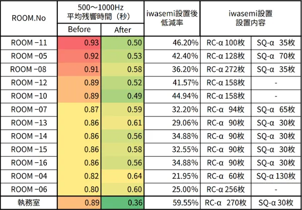 - 全 13 間會議室:iwasemi 設置前後的殘響時間測量結果