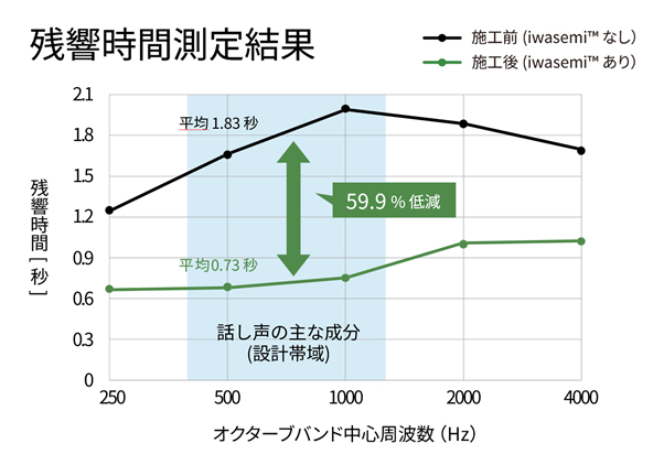 在本次專案中,我們針對「iwasemi™ RC-α透明吸音板」設置前後進行音響性能驗證。結果顯示,在人聲最常見的 500~1000 Hz 語音頻段,可將混響時間降低約 60%。